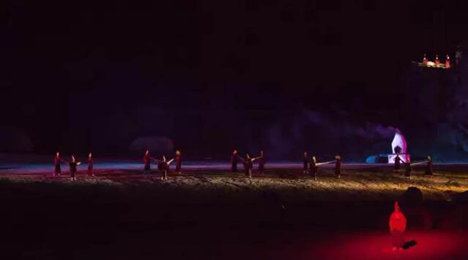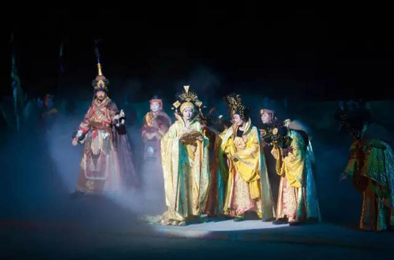 大型藏族實景劇《文成公主》主要講述文成公主入藏歷經(jīng)艱難的征途和曲折起伏的心路歷程,演繹大唐盛世的愛情傳奇,傳唱漢藏和美的動人史歌。該作品分為“大唐之韻”、“天地梵音”、“藏舞大美”、“藏舞大美”及“藏舞大美”五幕,深度融入漢藏歷史文化、民族風(fēng)俗、自然景觀等,引入了大唐歌舞和流傳久遠(yuǎn)的藏舞、藏戲、佛號念唱等,通過人工舞臺與自然山水的結(jié)合,用高科技的手段呈現(xiàn)非物質(zhì)文化遺產(chǎn),把戲劇、音樂、舞蹈和現(xiàn)代舞美手段融為一爐,構(gòu)成華美樂章。