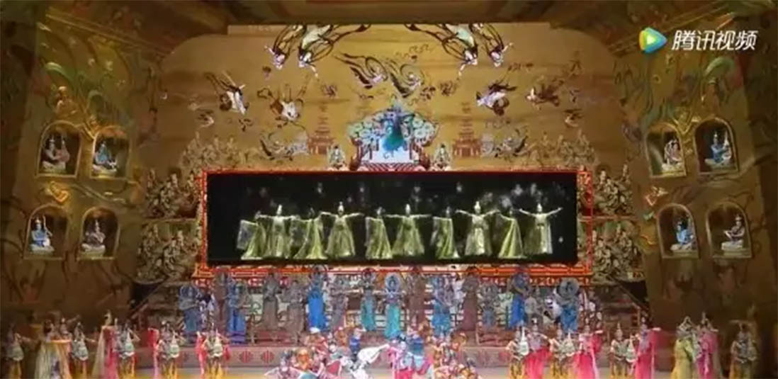 文藝晚會有效運用科技元素,使晚會的舞美設計帶有顯著特色。晚會多項節目散發舞美空間魅力,設計師巧妙地把節目的內在意境外化,觀眾也能隨著舞美空間馳騁在想象的旅程中。另外,《千年之約》等節目中,應用了全息投影技術,這也是杭州G20全息技術的升華應用,使壁畫中的人物栩栩如生,實現真實的演員和全息影像交替出現,與舞臺燈光完美結合,形成3D全息效果,達到似真似幻的效果。