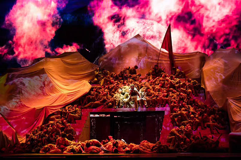舞臺上舞美布景與燈光、視頻、投影等舞臺視覺形式的有機融合是晚會的亮點與難點。如此豪邁氣概的演出得益于晚會陣容強大的幕后團隊:總導演楊笑陽、舞美總設計孫天衛、燈光總設計沙曉嵐、音頻總設計何飚再加上其他行業精英成員強強聯合,以舞美、燈光、音響、投影、視頻、舞臺機械等多種舞臺手段,呈現出恢弘壯麗的舞臺效果。