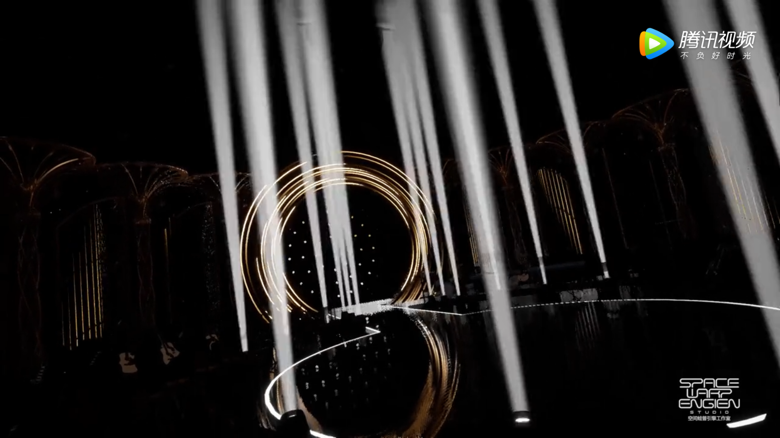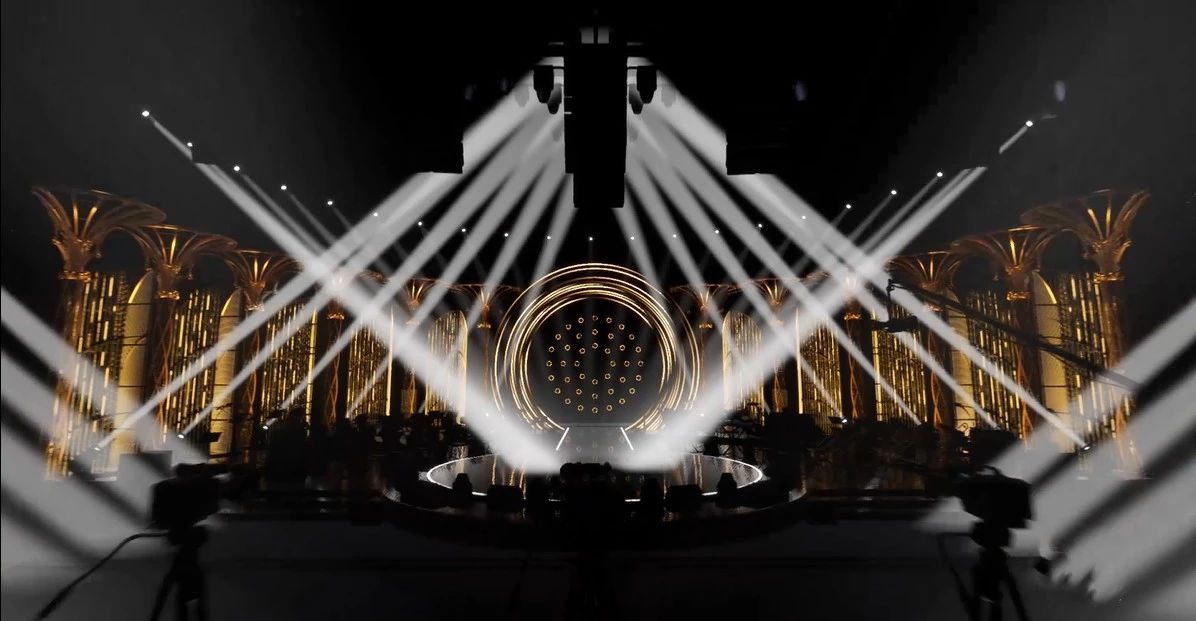作為本季舞美的情懷加分項,極具節目標識性的圓環赫然矗立中央,在全新加入的流線燈光的營造下,更具超現代科技氛圍。而圓環兩邊,順次排開十二根金色珠光圓柱,柱體之間陳列的旋轉體則是本季創新的重點。該旋轉體分為三面,其中兩面為亞克力三角細柱,柱上貼有LED數碼條,當歌手演唱時,旋轉體可作為渲染燈光的介質,承接多種曲風的氛圍效果;另外一面則為矩形燈陣。當浩洋燈光亮起時,貫徹了一如既往的高端視感,打造了新一輪的視覺盛宴,為觀眾帶來璀璨奪目的視覺享受。
