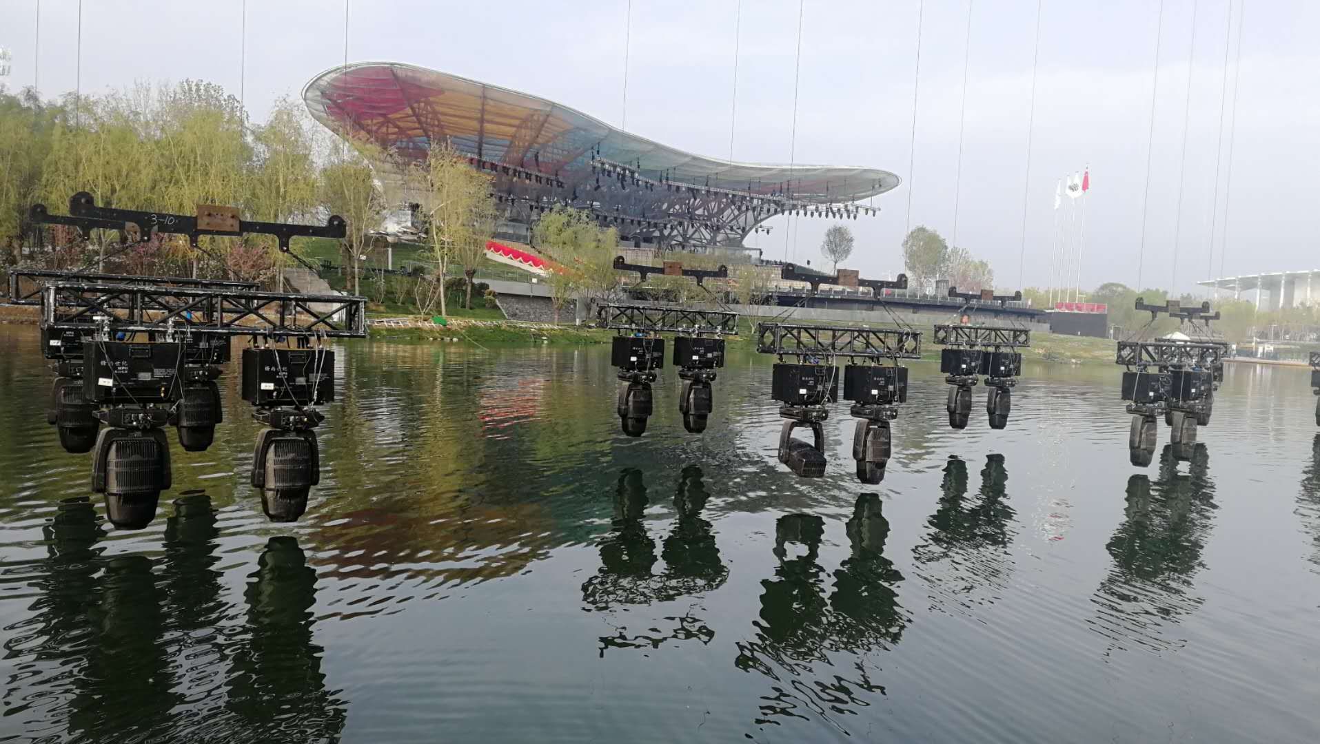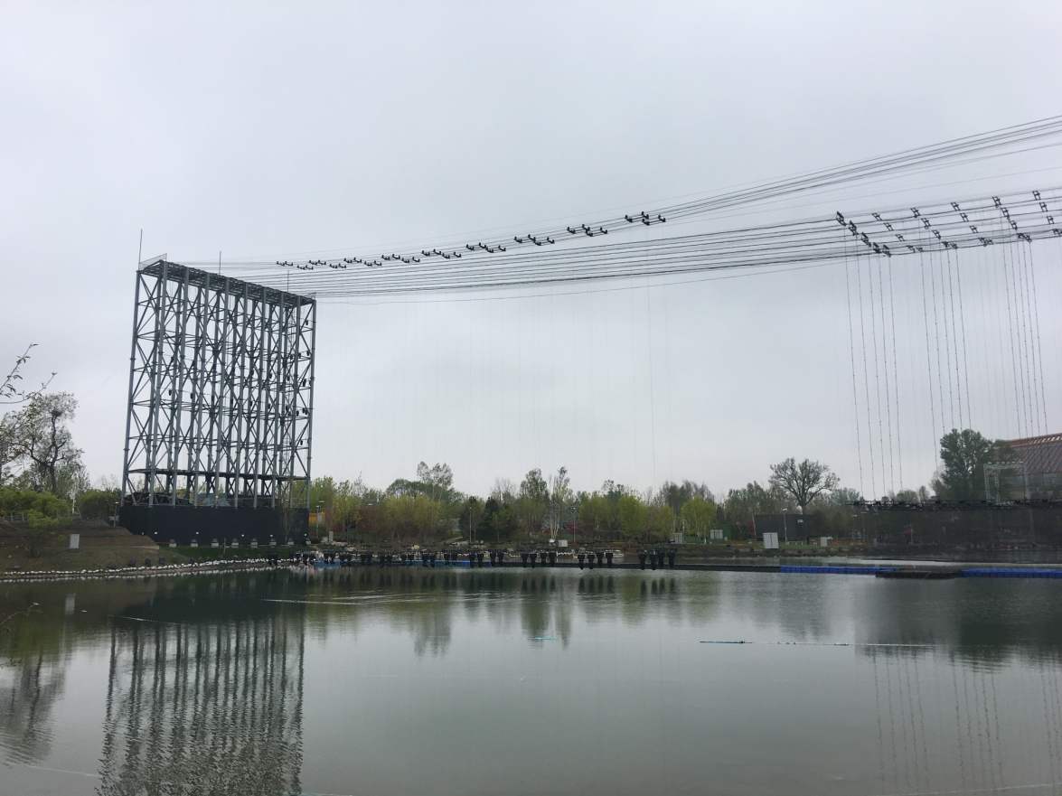 為了承載背景網屏和燈光設備,開幕式專門臨時搭建了兩座鋼結構威亞塔架,塔高39米,塔間跨度280米。塔間共搭設重型威亞索道16套,吊點總數218個。使用威亞控制系統將藝術空間擴展升華,空中矩陣隱形LED屏幕、空中矩陣數控飛燈等與地面舞臺表演完美結合,給觀眾帶來超強的視覺震撼效果。