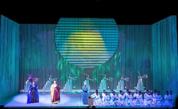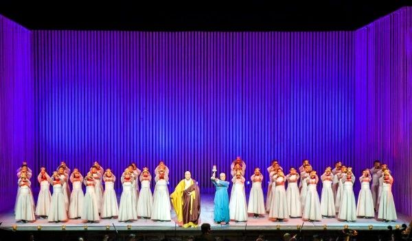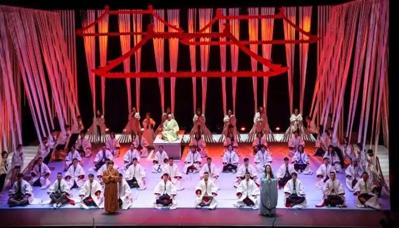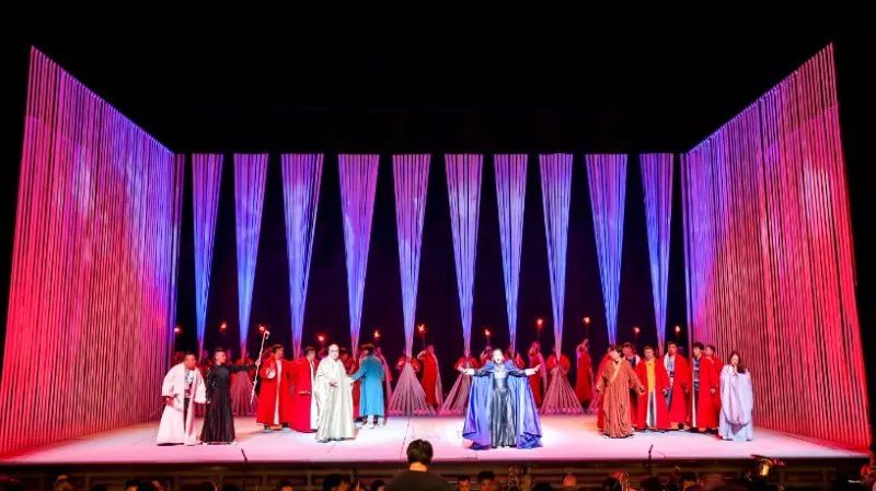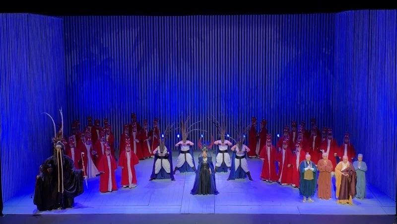《鑒真東渡》運(yùn)用歌劇這一國際通識的藝術(shù)表達(dá)話語,配合有感染力的表演,富有創(chuàng)意的舞美燈光設(shè)計,生動、立體的人物架構(gòu),在遵循歌劇藝術(shù)規(guī)律的基礎(chǔ)上,創(chuàng)造性地將江蘇民歌元素和佛教音樂的旋律融入其中,讓歌劇更富有地域特色,呈現(xiàn)出不同于純粹西方歌劇的風(fēng)格,展現(xiàn)出東方所特有的歷史厚重感與人文風(fēng)貌。