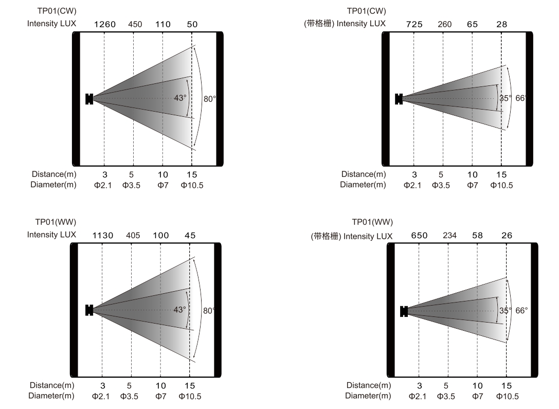 變焦范圍:光束角度:43°(可選格柵 35°),光斑角度:80°(可選格柵 66°)
